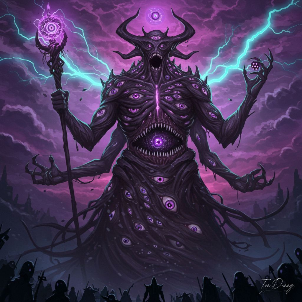 “A massive, eldritch titan rises from the void, its colossal form covered in countless, unblinking eyes, each one pulsating with the chaotic energy of a different dimension. Its body, shifting between amorphous flesh and jagged obsidian, trembles as reality itself strains to contain its presence. Atop its many arms, it holds a staff woven from twisted, living bones, its tip crowned with a sphere that distorts time and space. Around it, the sky writhes with streaks of neon lightning, and the very concept of “up” and “down” becomes meaningless in its presence. Its mouth, a spiraling void of shifting teeth and infinite depth, speaks in a voice that unravels sanity itself. Those who gaze into its countless eyes see not themselves, but fragmented visions of all possible futures, all possible deaths. It does not rage. It does not hunger. It simply exists, and existence itself is its curse.”