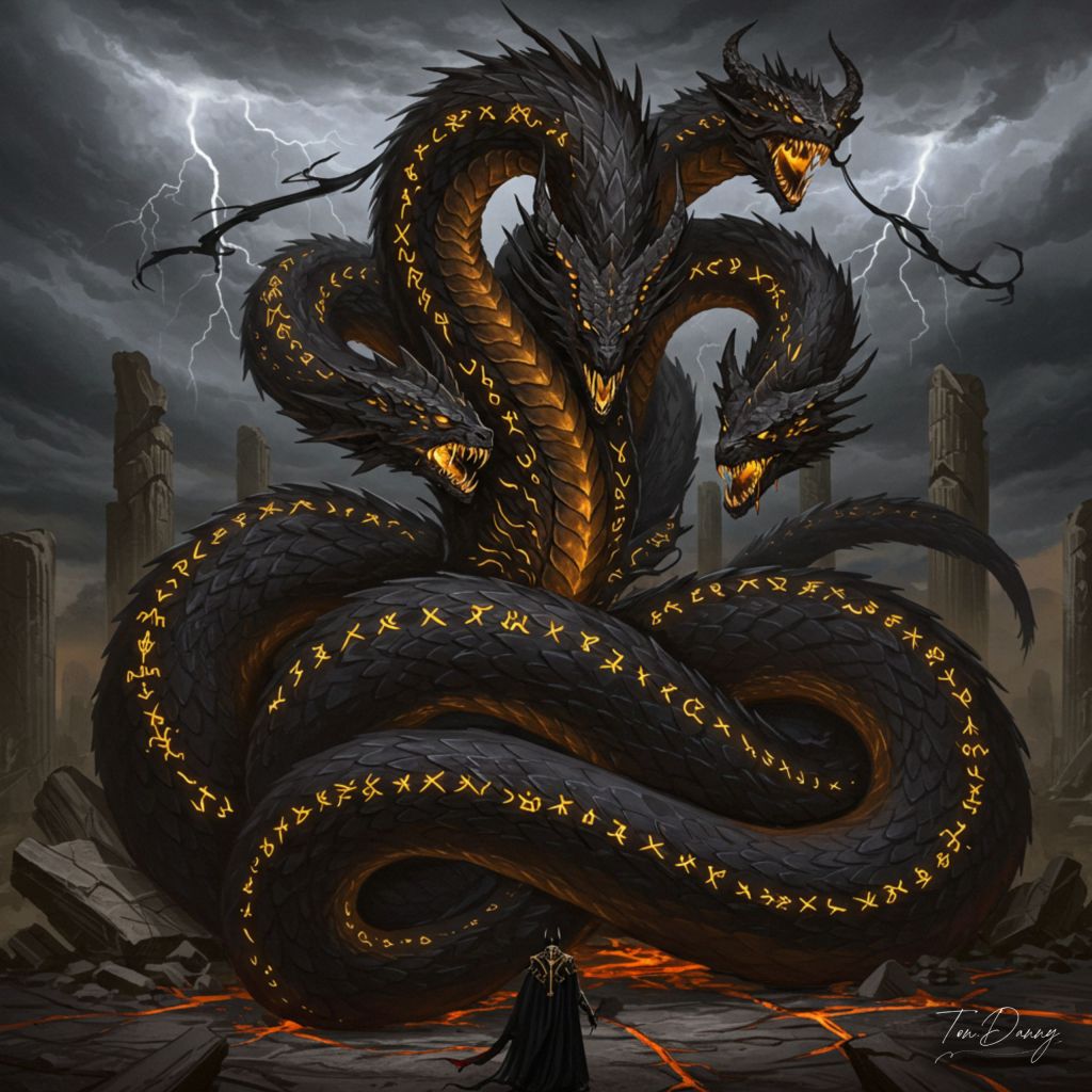 “Coiled around the ruins of a forgotten civilization, a colossal, multi-headed serpent slumbers beneath a sky of swirling black storms. Its obsidian scales gleam with an unnatural luster, etched with pulsating golden sigils that shift and writhe like living runes. Its seven heads, each resembling a different monstrous entity—a dragon, a wolf, a demon, and more—snarl and twist, their glowing, soulless eyes locked in an eternal gaze upon the world below. Their fangs drip with a venom so corrosive that it dissolves stone upon contact, forming rivers of molten ruin across the desolate landscape. From the serpent’s back, twisted black tendrils rise like living banners, crackling with abyssal lightning. The very air around it is heavy, suffocating, pressing down like the weight of an ancient curse. It does not move. It does not need to. The world itself trembles beneath its slumber, as if fearing the moment it awakens once more.”