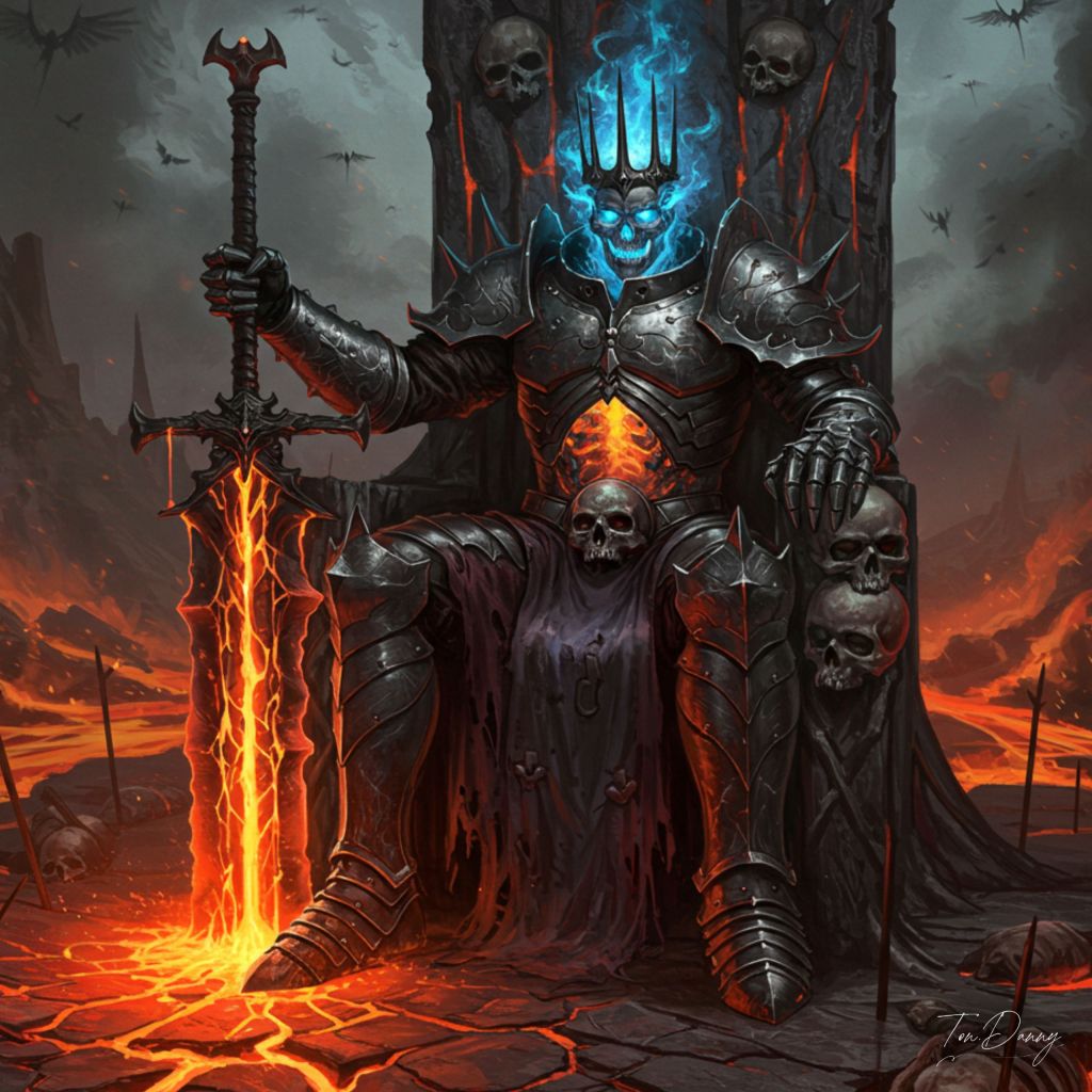 “Seated upon a throne of impaled corpses, the Hellfire Corpse Emperor looms over his accursed domain, his skeletal form clad in armor forged from the fused bones of fallen kings. His fleshless face, obscured by an iron crown of jagged spikes, burns with an eternal blue flame that flickers through the empty sockets where his eyes once resided. His right hand rests upon the pommel of a colossal, two-handed sword, its blade split down the middle and filled with roiling magma. With every pulse of his unholy power, the weapon shudders and drips molten steel, as if barely able to contain the infernal energy within. The ground beneath his throne is fractured and smoldering, rivers of ember-streaked lava weaving between the remains of those who dared to oppose him. Above, the sky is choked with ash, the faint silhouettes of winged wraiths circling in endless, silent reverence. He does not speak, nor does he move—for he is already dead, yet his will binds the abyss itself.”