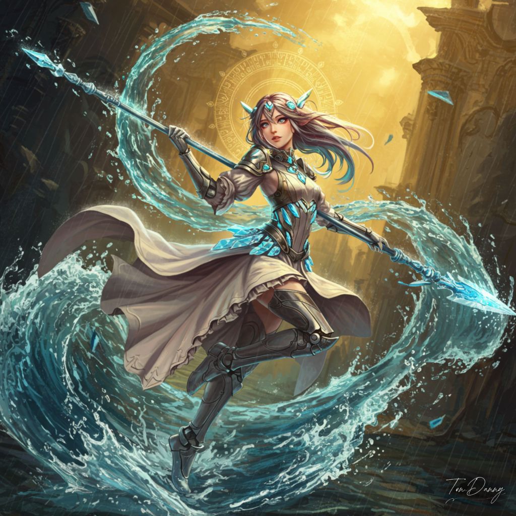 In the center of the painting, a beautiful girl with anime-inspired features is depicted in mid-motion, her cyber-Victorian dress caught in a sweeping gust of wind. Rendered in a style reminiscent of classical European oil paintings, the work emphasizes expressive brushwork, layered textures, and deep chiaroscuro. Each fold of her fabric and strand of hair is captured with painterly richness, lending the scene a sense of sacred timelessness. The lighting is theatrical and divine—golden highlights and soft shadows envelop her form, drawing the eye to her movement and expression. The composition follows a baroque sensibility, with dynamic poses, dramatic depth, and a harmonious blend of fantasy and elegance. The overall effect evokes a solemn yet ethereal atmosphere, as if the painting itself were a relic from an alternate mythic history. Spinning with a long azure glaive, she unleashes a crescent wave of water-like force. Her dress is light yet ceremonial, reinforced with crystalline plating along the hips and chest. Her steps are precise like a dancer’s, yet lethal in intent—each movement blurring into the next. Her glaive glows at the edges like frozen mist, and raindrops hover around her as if caught in her rhythm.