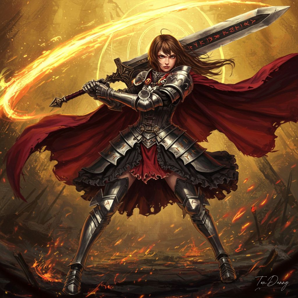 In the center of the painting, a beautiful girl with anime-inspired features is depicted in mid-motion, her cyber-Victorian dress caught in a sweeping gust of wind. Rendered in a style reminiscent of classical European oil paintings, the work emphasizes expressive brushwork, layered textures, and deep chiaroscuro. Each fold of her fabric and strand of hair is captured with painterly richness, lending the scene a sense of sacred timelessness. The lighting is theatrical and divine—golden highlights and soft shadows envelop her form, drawing the eye to her movement and expression. The composition follows a baroque sensibility, with dynamic poses, dramatic depth, and a harmonious blend of fantasy and elegance. The overall effect evokes a solemn yet ethereal atmosphere, as if the painting itself were a relic from an alternate mythic history. She stands in a wide, grounded stance, mid-swing, her two hands gripping the hilt of a massive greatsword that carves through the air in a divine arc. The weight of the blade and the force of her motion twist her cyber-Victorian battle gown in dramatic motion—its crimson and black fabric rippling outward like wings. Her full armor glows with etched runes: silver-plated greaves, symmetrical pauldrons, and a corset-like cuirass fused seamlessly with elegant cloth. Her crimson cape flares behind her, cut sharply at the hem, mirroring the blade’s motion. Her gaze is focused, intense, jaw clenched—not in rage, but unshakable purpose. Embers scatter through the scene as if frozen in time, echoing the sacred violence of her movement.