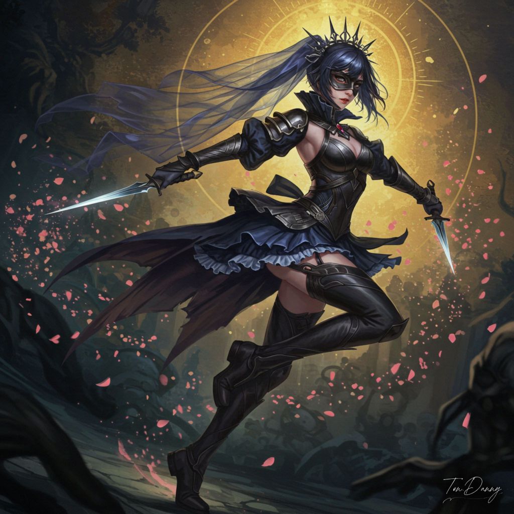 In the center of the painting, a beautiful girl with anime-inspired features is depicted in mid-motion, her cyber-Victorian dress caught in a sweeping gust of wind. Rendered in a style reminiscent of classical European oil paintings, the work emphasizes expressive brushwork, layered textures, and deep chiaroscuro. Each fold of her fabric and strand of hair is captured with painterly richness, lending the scene a sense of sacred timelessness. The lighting is theatrical and divine—golden highlights and soft shadows envelop her form, drawing the eye to her movement and expression. The composition follows a baroque sensibility, with dynamic poses, dramatic depth, and a harmonious blend of fantasy and elegance. The overall effect evokes a solemn yet ethereal atmosphere, as if the painting itself were a relic from an alternate mythic history. A veil fluttering behind her, the girl pirouettes through shadows, twin daggers flashing with cold light. Her form is sleek yet ornate—a black-and-indigo bodysuit layered with armor-like lace and asymmetrical skirts that mimic falling petals. Her mask is pulled halfway, revealing a cold, calculating expression. In her wake, glowing sakura-like particles trail in the air, a blend of poison and beauty. Her movement carves through moonlight like a ghost—silent, perfect, deadly.