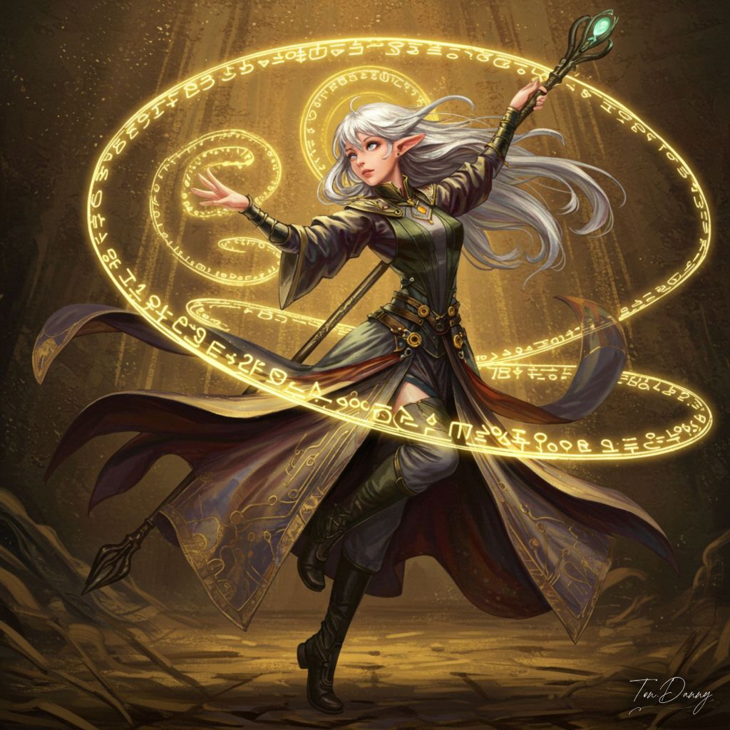 In the center of the painting, a beautiful girl with anime-inspired features is depicted in mid-motion, her cyber-Victorian dress caught in a sweeping gust of wind. Rendered in a style reminiscent of classical European oil paintings, the work emphasizes expressive brushwork, layered textures, and deep chiaroscuro. Each fold of her fabric and strand of hair is captured with painterly richness, lending the scene a sense of sacred timelessness. The lighting is theatrical and divine—golden highlights and soft shadows envelop her form, drawing the eye to her movement and expression. The composition follows a baroque sensibility, with dynamic poses, dramatic depth, and a harmonious blend of fantasy and elegance. The overall effect evokes a solemn yet ethereal atmosphere, as if the painting itself were a relic from an alternate mythic history. She conjures a spiral of glowing glyphs mid-twirl, a long staff levitating beside her. Her layered robes flow like stained glass in motion—translucent silk laced with circuitry-like embroidery, shimmering softly. Her long silver hair flickers with strands of light, and her eyes glow with focused incantation. Magic weaves around her, forming luminous arcs that curl like celestial vines. The air around her bends subtly, as if time is folding with her dance.