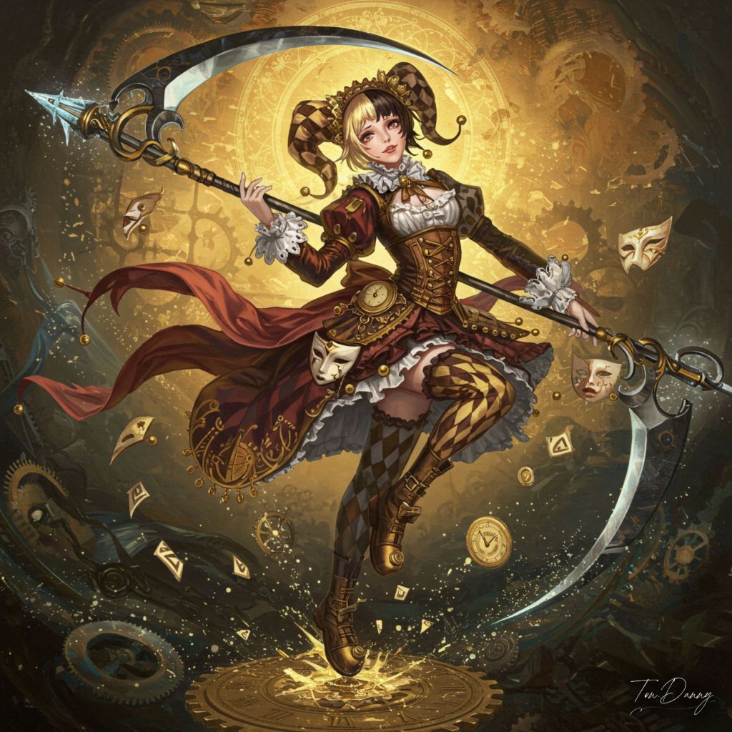 In the center of the painting, a beautiful girl with anime-inspired features is depicted in mid-motion, her cyber-Victorian dress caught in a sweeping gust of wind. Rendered in a style reminiscent of classical European oil paintings, the work emphasizes expressive brushwork, layered textures, and deep chiaroscuro. Each fold of her fabric and strand of hair is captured with painterly richness, lending the scene a sense of sacred timelessness. The lighting is theatrical and divine—golden highlights and soft shadows envelop her form, drawing the eye to her movement and expression. The composition follows a baroque sensibility, with dynamic poses, dramatic depth, and a harmonious blend of fantasy and elegance. The overall effect evokes a solemn yet ethereal atmosphere, as if the painting itself were a relic from an alternate mythic history. Caught in mid-leap, she balances delicately on the tip of a floating gear. Her outfit is a fractured blend of jester and oracle—clockwork motifs, checkered silks, and asymmetrical mask pieces scattered across her flowing form. Time-bending symbols swirl at her feet, while her dual-bladed scythe leaves a trail of frozen sparks. Her face is split between joy and grief, half-smiling as if dancing on the edge of reality. The background distorts slightly, as if the canvas itself were warping with her presence.