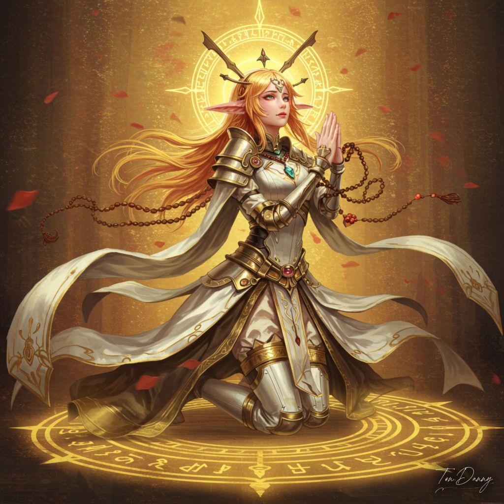 In the center of the painting, a beautiful girl with anime-inspired features is depicted in mid-motion, her cyber-Victorian dress caught in a sweeping gust of wind. Rendered in a style reminiscent of classical European oil paintings, the work emphasizes expressive brushwork, layered textures, and deep chiaroscuro. Each fold of her fabric and strand of hair is captured with painterly richness, lending the scene a sense of sacred timelessness. The lighting is theatrical and divine—golden highlights and soft shadows envelop her form, drawing the eye to her movement and expression. The composition follows a baroque sensibility, with dynamic poses, dramatic depth, and a harmonious blend of fantasy and elegance. The overall effect evokes a solemn yet ethereal atmosphere, as if the painting itself were a relic from an alternate mythic history. She kneels mid-turn, prayer beads flaring outward with the wind, one hand raised in silent benediction. Her flowing white and gold robes are layered with ritual embroidery and armored segments around the forearms and chest. A glowing lotus-like halo floats behind her head, while faint glyphs rise from the floor in concentric rings. Her expression is serene but unwavering, and holy light wraps her in a solemn aura—as if she herself is the vessel of divine will.