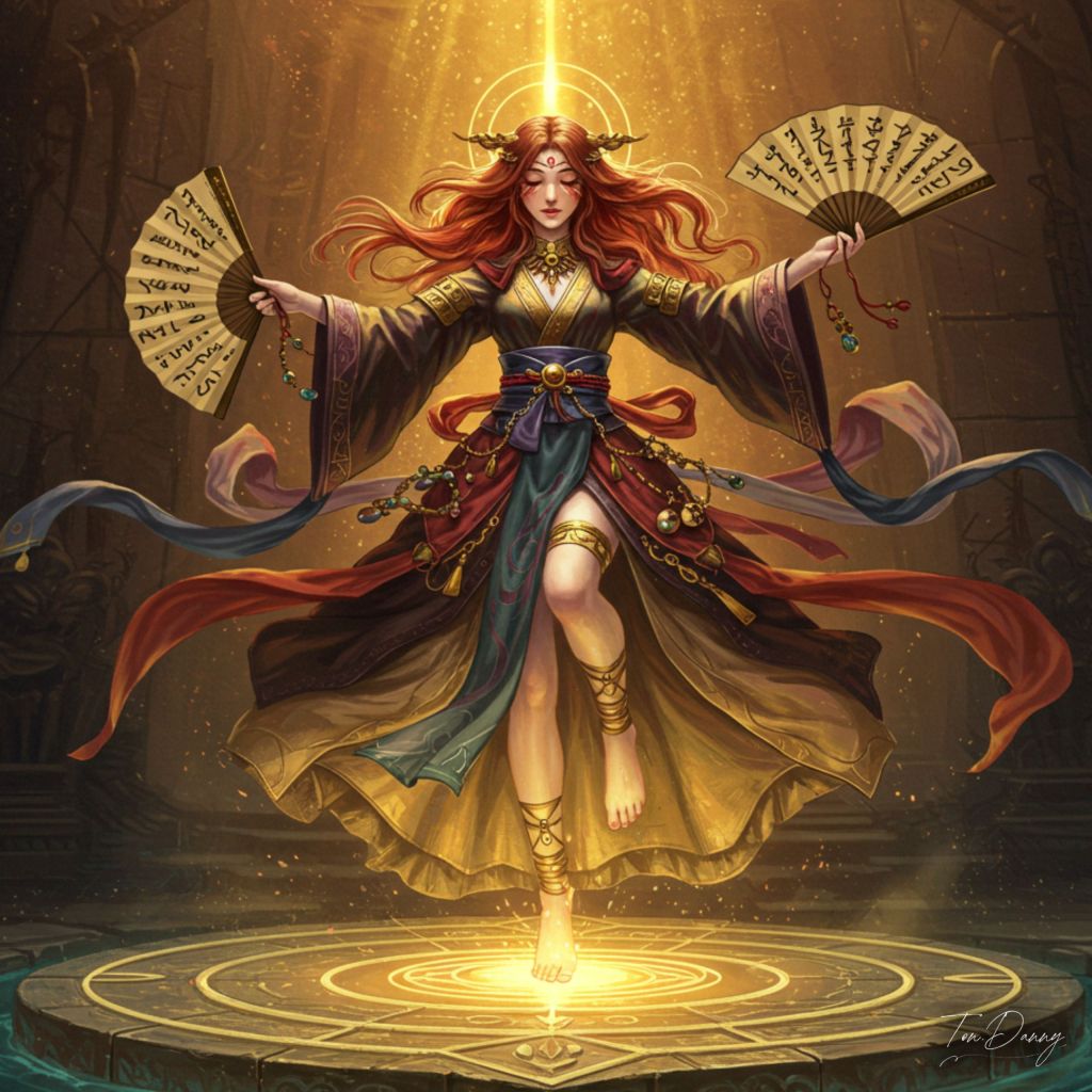 In the center of the painting, a beautiful girl with anime-inspired features is depicted in mid-motion, her cyber-Victorian dress caught in a sweeping gust of wind. Rendered in a style reminiscent of classical European oil paintings, the work emphasizes expressive brushwork, layered textures, and deep chiaroscuro. Each fold of her fabric and strand of hair is captured with painterly richness, lending the scene a sense of sacred timelessness. The lighting is theatrical and divine—golden highlights and soft shadows envelop her form, drawing the eye to her movement and expression. The composition follows a baroque sensibility, with dynamic poses, dramatic depth, and a harmonious blend of fantasy and elegance. The overall effect evokes a solemn yet ethereal atmosphere, as if the painting itself were a relic from an alternate mythic history. She performs a sacred ritual dance atop a luminous stone platform, her flowing robes adorned with talismanic charms and sacred ribbons. In each hand, she holds a fan inscribed with shifting script, one open in motion, the other closing in reverence. Her eyes are half-lidded in divine trance, as spiritual fire rises behind her in an arc of protective light. Her bare feet leave ripples on a shallow glowing pool, as if the floor itself reflects a hidden world beneath.