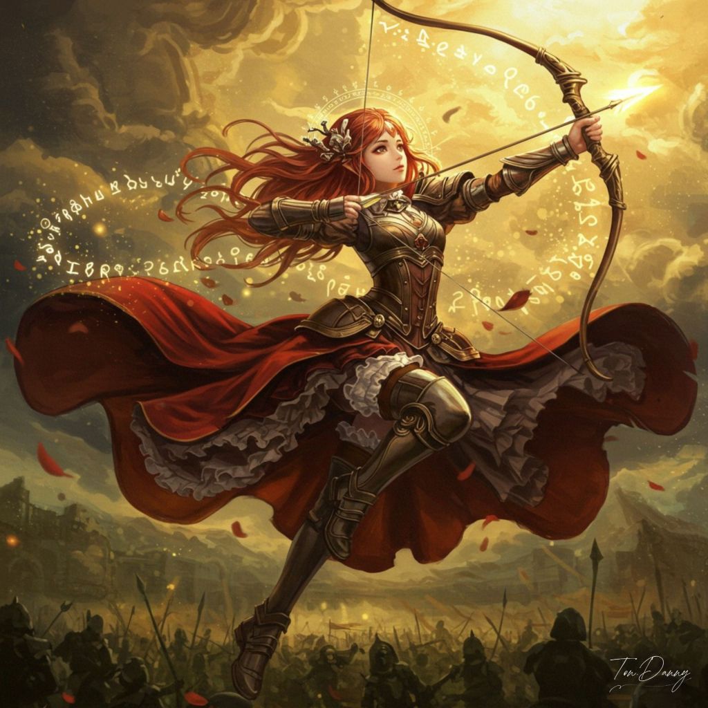 In the center of the painting, a beautiful girl with anime-inspired features is depicted in mid-motion, her cyber-Victorian dress caught in a sweeping gust of wind. Rendered in a style reminiscent of classical European oil paintings, the work emphasizes expressive brushwork, layered textures, and deep chiaroscuro. Each fold of her fabric and strand of hair is captured with painterly richness, lending the scene a sense of sacred timelessness. The lighting is theatrical and divine—golden highlights and soft shadows envelop her form, drawing the eye to her movement and expression. The composition follows a baroque sensibility, with dynamic poses, dramatic depth, and a harmonious blend of fantasy and elegance. The overall effect evokes a solemn yet ethereal atmosphere, as if the painting itself were a relic from an alternate mythic history. Mid-air and upside down, she looses a luminous arrow from her ornate bow, its curve shaped like angelic wings. Her dress, woven from velvet and enchanted thread, flares around her like the petals of a blooming rose. Floating glyphs trail behind the arrow’s flight, and her eyes reflect the stars she aims toward. Below her, a battlefield blurred in distance—her mark already chosen by fate.