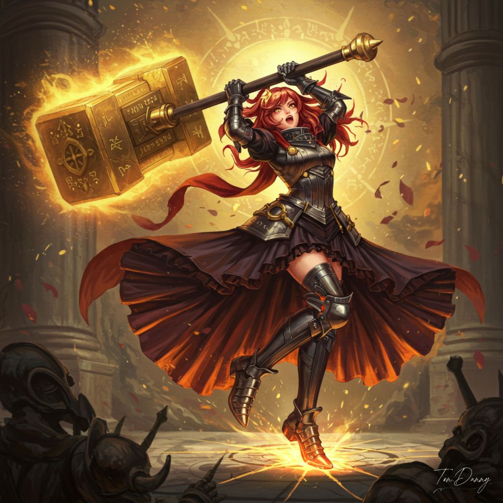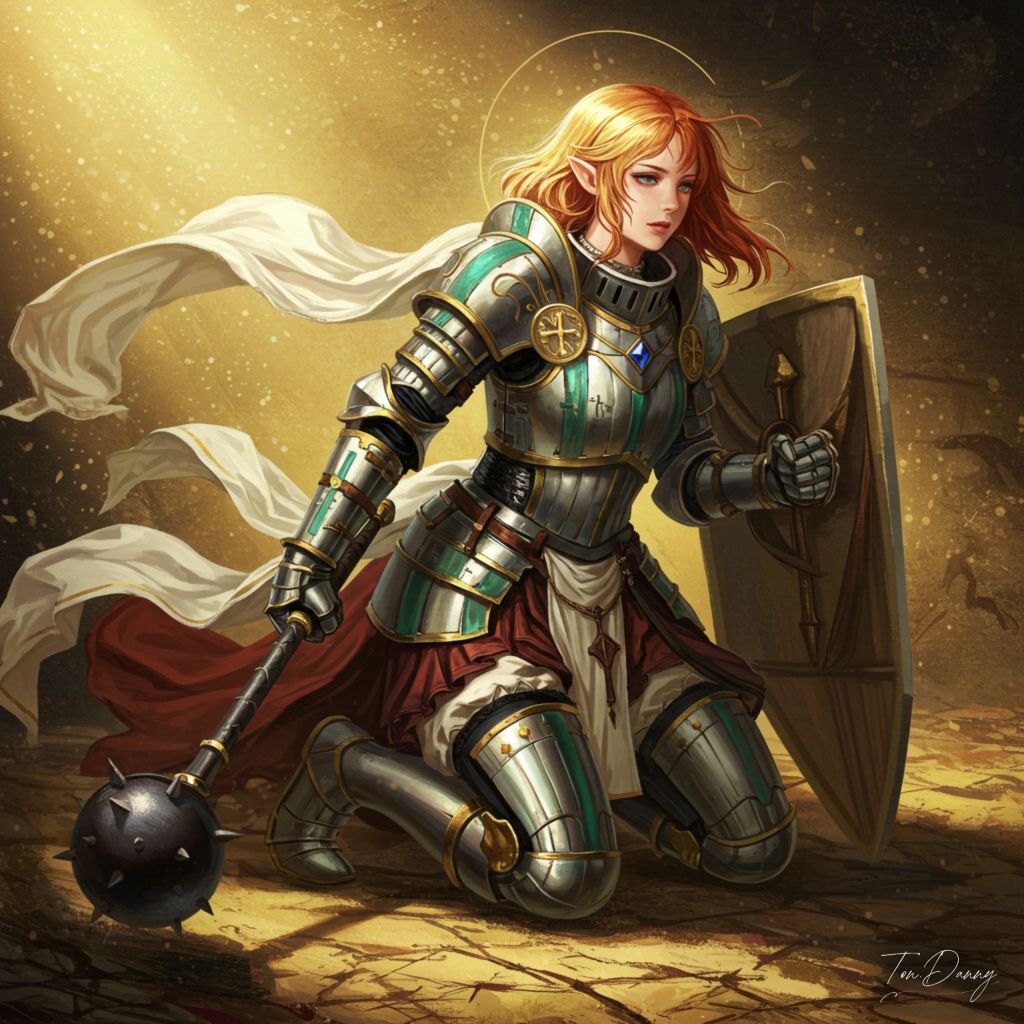 In the center of the painting, a beautiful girl with anime-inspired features is depicted in mid-motion, her cyber-Victorian dress caught in a sweeping gust of wind. Rendered in a style reminiscent of classical European oil paintings, the work emphasizes expressive brushwork, layered textures, and deep chiaroscuro. Each fold of her fabric and strand of hair is captured with painterly richness, lending the scene a sense of sacred timelessness. The lighting is theatrical and divine—golden highlights and soft shadows envelop her form, drawing the eye to her movement and expression. The composition follows a baroque sensibility, with dynamic poses, dramatic depth, and a harmonious blend of fantasy and elegance. The overall effect evokes a solemn yet ethereal atmosphere, as if the painting itself were a relic from an alternate mythic history. She kneels mid-stride, shield raised like a barrier between worlds. Her ornate armor glows faintly, inlaid with lapis channels that pulse with holy oaths. A white tabard billows around her like sacred wind, In one hand he holds a holy and sturdy mace for her defense is her divine act. Her expression is not fierce, but still—utterly resolute. A wall made flesh, born of faith and burden.