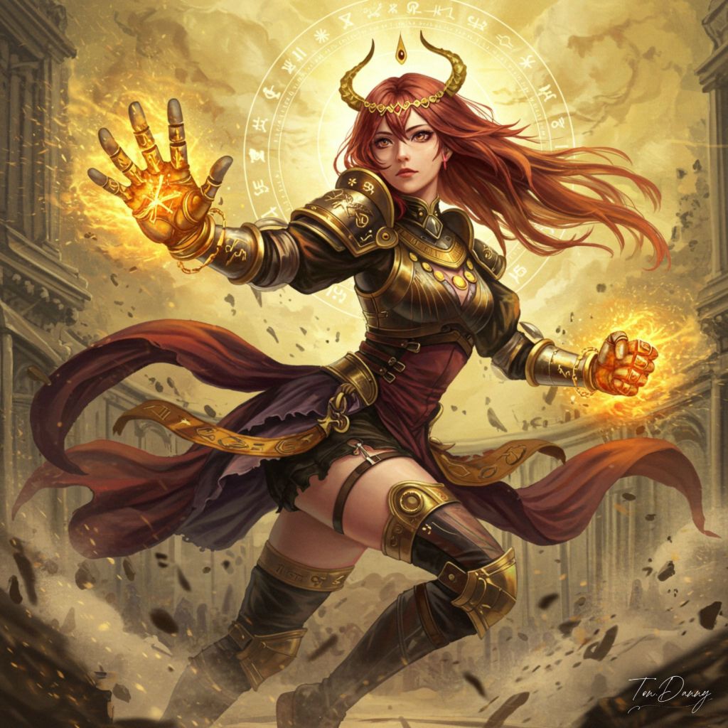 In the center of the painting, a beautiful girl with anime-inspired features is depicted in mid-motion, her cyber-Victorian dress caught in a sweeping gust of wind. Rendered in a style reminiscent of classical European oil paintings, the work emphasizes expressive brushwork, layered textures, and deep chiaroscuro. Each fold of her fabric and strand of hair is captured with painterly richness, lending the scene a sense of sacred timelessness. The lighting is theatrical and divine—golden highlights and soft shadows envelop her form, drawing the eye to her movement and expression. The composition follows a baroque sensibility, with dynamic poses, dramatic depth, and a harmonious blend of fantasy and elegance. The overall effect evokes a solemn yet ethereal atmosphere, as if the painting itself were a relic from an alternate mythic history. She thrusts forward with an open palm, gauntlets ablaze with alchemical sigils. Her dress is short and battle-torn, reinforced with ceremonial wrappings around the waist and legs. Gold-threaded gloves extend to her elbows, each finger engraved with zodiacal seals. Dust and shattered marble arc outward from her stance. Her gaze is laser-focused, like a living invocation of divine discipline through flesh and fist.