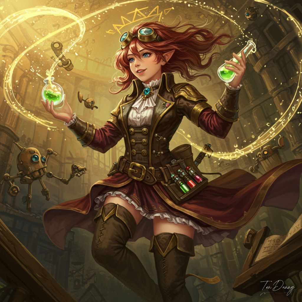 In the center of the painting, a beautiful girl with anime-inspired features is depicted in mid-motion, her cyber-Victorian dress caught in a sweeping gust of wind. Rendered in a style reminiscent of classical European oil paintings, the work emphasizes expressive brushwork, layered textures, and deep chiaroscuro. Each fold of her fabric and strand of hair is captured with painterly richness, lending the scene a sense of sacred timelessness. The lighting is theatrical and divine—golden highlights and soft shadows envelop her form, drawing the eye to her movement and expression. The composition follows a baroque sensibility, with dynamic poses, dramatic depth, and a harmonious blend of fantasy and elegance. The overall effect evokes a solemn yet ethereal atmosphere, as if the painting itself were a relic from an alternate mythic history. She pours glowing liquid from one floating vial into another mid-motion, trails of light twisting through the air. Her corseted coat is layered with potion belts and stitched with coded patterns, each seam a recipe. Clockwork constructs flutter behind her, casting sparks and runes. Her goggles rest atop windswept hair, and her sleeves flare as if caught in invisible combustion. Her eyes gleam—not with madness, but with the joy of transmutation.