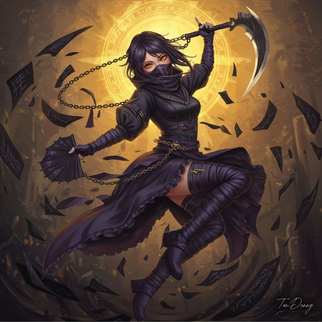 In the center of the painting, a beautiful girl with anime-inspired features is depicted in mid-motion, her cyber-Victorian dress caught in a sweeping gust of wind. Rendered in a style reminiscent of classical European oil paintings, the work emphasizes expressive brushwork, layered textures, and deep chiaroscuro. Each fold of her fabric and strand of hair is captured with painterly richness, lending the scene a sense of sacred timelessness. The lighting is theatrical and divine—golden highlights and soft shadows envelop her form, drawing the eye to her movement and expression. The composition follows a baroque sensibility, with dynamic poses, dramatic depth, and a harmonious blend of fantasy and elegance. The overall effect evokes a solemn yet ethereal atmosphere, as if the painting itself were a relic from an alternate mythic history. She blurs through the air mid-flip, a chain-sickle extended in one hand, kunai fanned in the other. Her outfit is tight and shadow-wrapped, trimmed in violet smoke-thread lace, and lined with sigils for silence and misdirection. Her mask only covers her mouth—revealing amber eyes that glint like a sharpened curse. Petals of ink-black paper swirl around her, forming a circular ward. She is the storm behind silence—formless, fatal, forgotten.