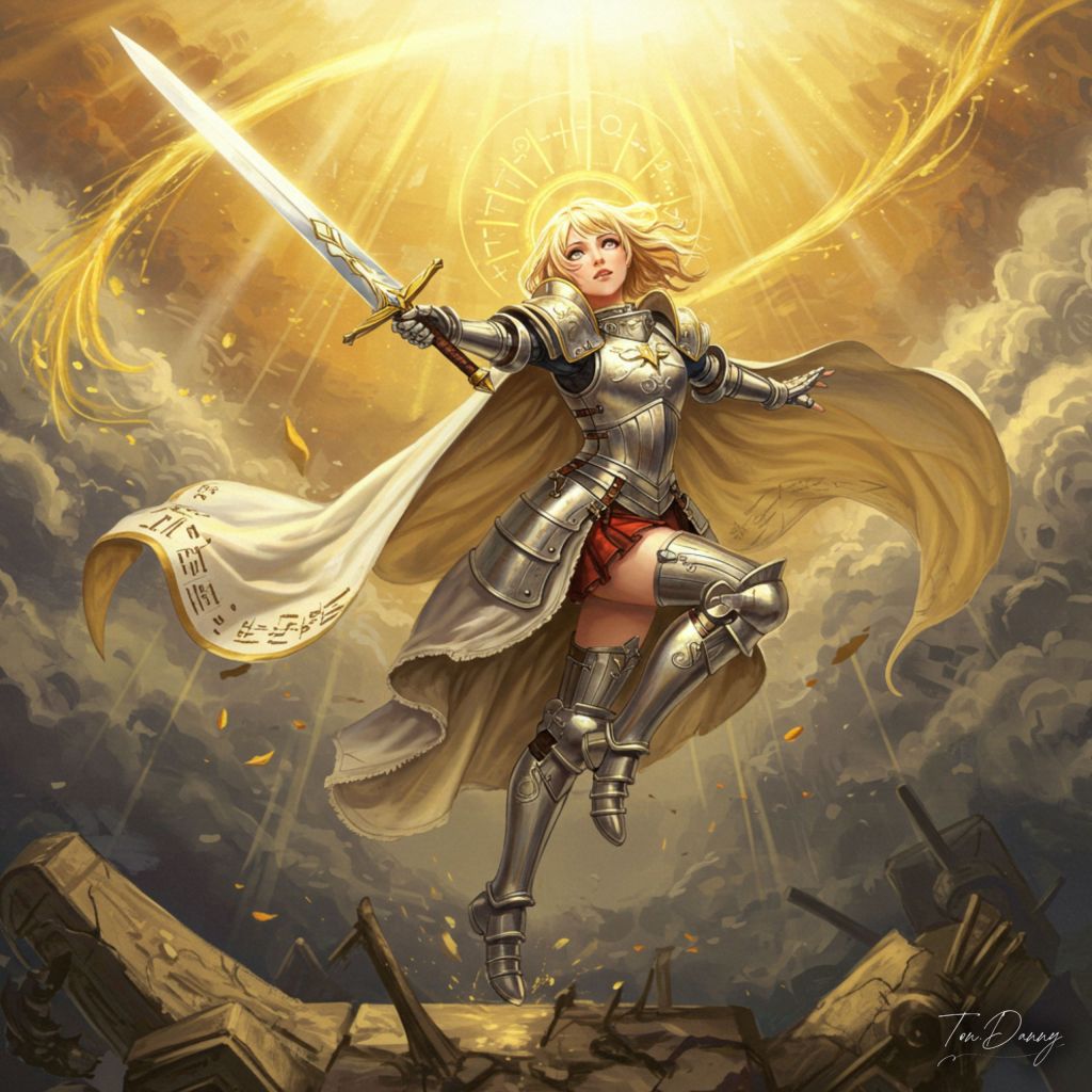 In the center of the painting, a beautiful girl with anime-inspired features is depicted in mid-motion, her cyber-Victorian dress caught in a sweeping gust of wind. Rendered in a style reminiscent of classical European oil paintings, the work emphasizes expressive brushwork, layered textures, and deep chiaroscuro. Each fold of her fabric and strand of hair is captured with painterly richness, lending the scene a sense of sacred timelessness. The lighting is theatrical and divine—golden highlights and soft shadows envelop her form, drawing the eye to her movement and expression. The composition follows a baroque sensibility, with dynamic poses, dramatic depth, and a harmonious blend of fantasy and elegance. The overall effect evokes a solemn yet ethereal atmosphere, as if the painting itself were a relic from an alternate mythic history. Leaping from the edge of a shattered monument, she brandishes a radiant sword forged from crystallized light. Her armor is noble yet unostentatious—silver plates engraved with faded hymns and a flowing white-gold cape that arcs like the wings of destiny. Her expression burns with unwavering hope, her body a blur of righteous purpose. Behind her, the clouds part—not for her—but because she commands their reverence.