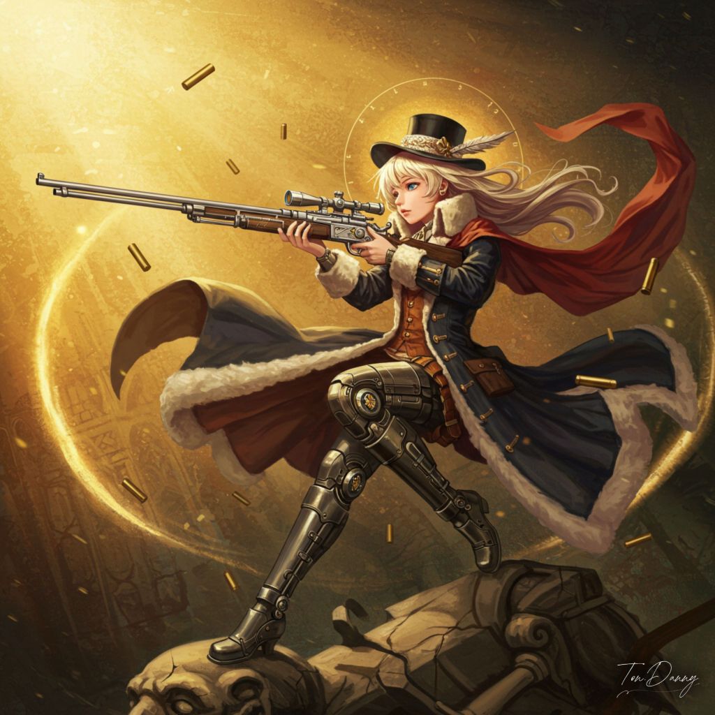 In the center of the painting, a beautiful girl with anime-inspired features is depicted in mid-motion, her cyber-Victorian dress caught in a sweeping gust of wind. Rendered in a style reminiscent of classical European oil paintings, the work emphasizes expressive brushwork, layered textures, and deep chiaroscuro. Each fold of her fabric and strand of hair is captured with painterly richness, lending the scene a sense of sacred timelessness. The lighting is theatrical and divine—golden highlights and soft shadows envelop her form, drawing the eye to her movement and expression. The composition follows a baroque sensibility, with dynamic poses, dramatic depth, and a harmonious blend of fantasy and elegance. The overall effect evokes a solemn yet ethereal atmosphere, as if the painting itself were a relic from an alternate mythic history. Suspended atop a broken gargoyle, she fires a long, silver-barreled rifle laced with moonstone circuitry. Her coat, trimmed in pale glinting velvet, flows behind her like a comet’s tail. Her expression is calm, breath held in eternal silence. Brass casings float midair, caught in a crescent arc. In her scope—fate waits to be rewritten.