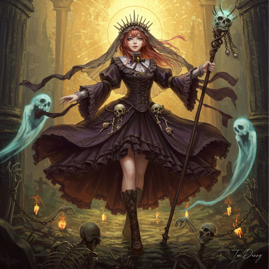 In the center of the painting, a beautiful girl with anime-inspired features is depicted in mid-motion, her cyber-Victorian dress caught in a sweeping gust of wind. Rendered in a style reminiscent of classical European oil paintings, the work emphasizes expressive brushwork, layered textures, and deep chiaroscuro. Each fold of her fabric and strand of hair is captured with painterly richness, lending the scene a sense of sacred timelessness. The lighting is theatrical and divine—golden highlights and soft shadows envelop her form, drawing the eye to her movement and expression. The composition follows a baroque sensibility, with dynamic poses, dramatic depth, and a harmonious blend of fantasy and elegance. The overall effect evokes a solemn yet ethereal atmosphere, as if the painting itself were a relic from an alternate mythic history. She waltzes through a grave of flickering bones, her veil swirling like decaying lace. Her dress is stitched with bone charms and corpse-threads, and her staff coils with chained phantoms. Ghostly hands rise beneath her with gestures of reverence, not violence. Her gaze is not cruel, but coldly maternal—as if guiding the dead into sacred silence.