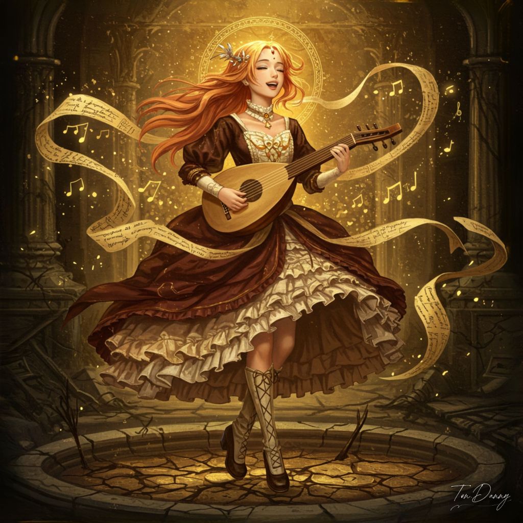 In the center of the painting, a beautiful girl with anime-inspired features is depicted in mid-motion, her cyber-Victorian dress caught in a sweeping gust of wind. Rendered in a style reminiscent of classical European oil paintings, the work emphasizes expressive brushwork, layered textures, and deep chiaroscuro. Each fold of her fabric and strand of hair is captured with painterly richness, lending the scene a sense of sacred timelessness. The lighting is theatrical and divine—golden highlights and soft shadows envelop her form, drawing the eye to her movement and expression. The composition follows a baroque sensibility, with dynamic poses, dramatic depth, and a harmonious blend of fantasy and elegance. The overall effect evokes a solemn yet ethereal atmosphere, as if the painting itself were a relic from an alternate mythic history. She sings over a crumbling, dried-up fountain. lute strummed mid-air as if the strings themselves float with her voice. Her dress is layered in ribbons of verse, fluttering with radiant script. Her hair glows with starlight, and spectral notes swirl behind her like fireflies. She smiles—not to the viewer, but to the memory of a world that no longer exists.