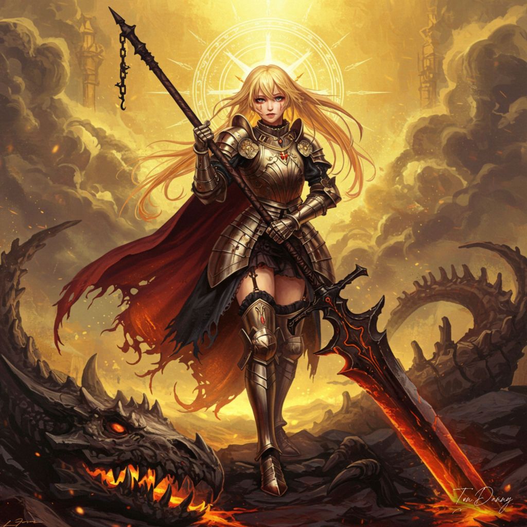 In the center of the painting, a beautiful girl with anime-inspired features is depicted in mid-motion, her cyber-Victorian dress caught in a sweeping gust of wind. Rendered in a style reminiscent of classical European oil paintings, the work emphasizes expressive brushwork, layered textures, and deep chiaroscuro. Each fold of her fabric and strand of hair is captured with painterly richness, lending the scene a sense of sacred timelessness. The lighting is theatrical and divine—golden highlights and soft shadows envelop her form, drawing the eye to her movement and expression. The composition follows a baroque sensibility, with dynamic poses, dramatic depth, and a harmonious blend of fantasy and elegance. The overall effect evokes a solemn yet ethereal atmosphere, as if the painting itself were a relic from an alternate mythic history. She stands atop a dragon’s skeletal remains, her armor cracked and scorched, yet gleaming like forged moonlight. In her hands, she drags a massive jagged lance—its core blackened, its tip glowing with residual wyrmfire. Her torn cape flutters like broken wings, and molten ash swirls around her boots. Her expression is not triumphant, but burdened—like a blade that remembers every scream it silenced.